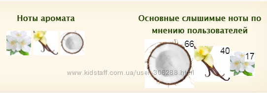 Композиция аромата включает ноты: Белые цветы, Ваниль и Кокос.