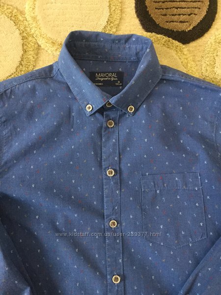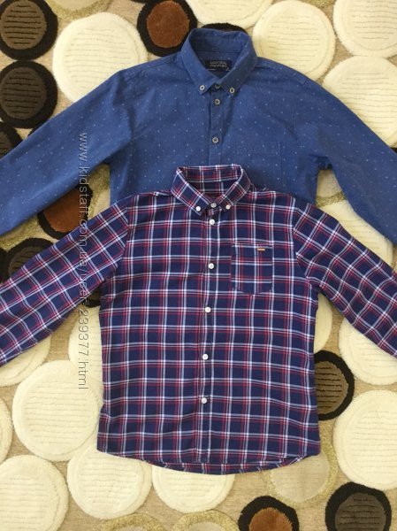 Рубашки фирмы Mayoral.Фото 2-6: р. 134. Хорошое состояние, нюанс- зашитая дырочка возле второй от верха пуговицы, но когда рубашка застегнутая ее не видно (фото 5). Замеры: длина рукава - 47,5см + 10,5см плечо; длина по спине - 55см; ПО под руками - 41см.