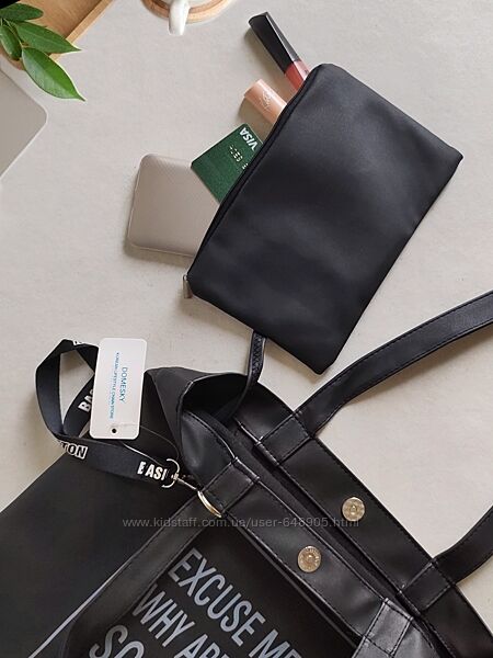 Удобная сумка шоппер из мягкого ПВХ с надписью. Внутренняя отделка - байка. В комплекте кошелёк и лента-брелок для ключей. В наличии чёрного цвета.Размеры сумки: Ширина — 36 см, высота — 39 см, толщина дна — 1 см