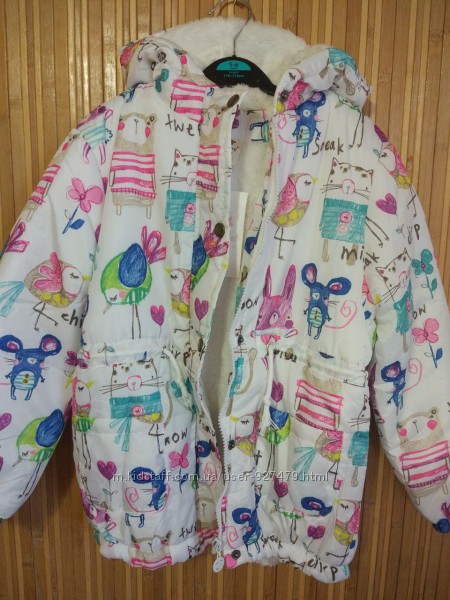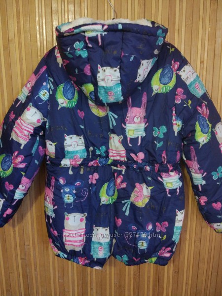 Теплые и красивые демисезонные курточки для девочек. Цвет синий и белый со зверушками. Размер-110-116 на 4-6 лет. Длина-51 см, ширина по линии груди-42×2 см, рукав от плеча-45 см. Верх-типа плащёвки, внутри и капюшон-мягкая меховушка, очень приятная на ощупь.