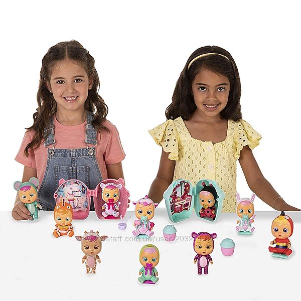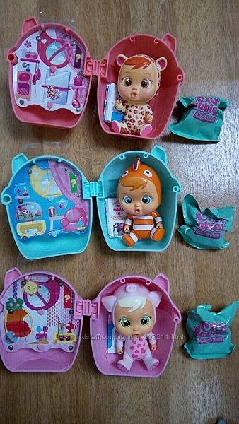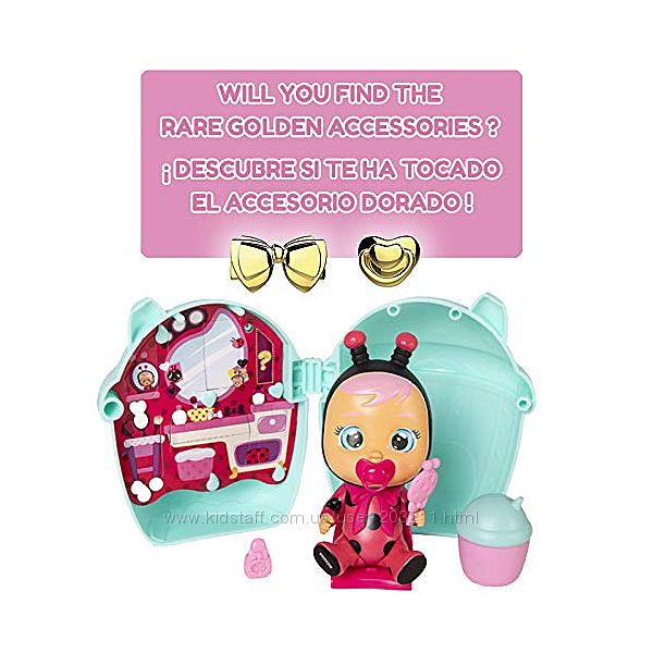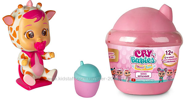 Младенец CryBabies Magic Tears живет в домике . Дом сделан в форме детской бутылки и состоит из двух половинок - в одной половине находится куколка, а в другой несколько тематических аксессуаров. Среди аксессуаров есть бутылочка, бантик, стульчик и пустышка. Из бутылки малыш пьет воду, а потом плачет настоящими слезами. Если плаксе дать соску, он успокоится. Кроме общих аксессуаров, есть еще особенные вещицы, которые принадлежат только одному пупсу из серии. Какая именно кукла находится в домике, можно узнать только после вскрытия упаковки, ведь это игрушка-сюрприз!