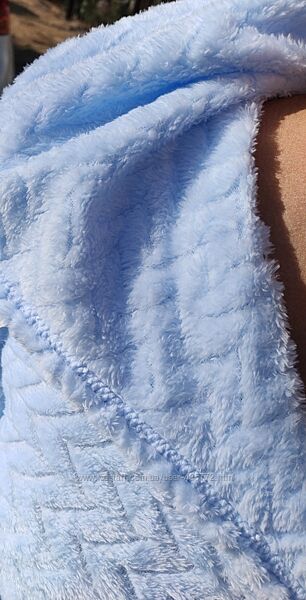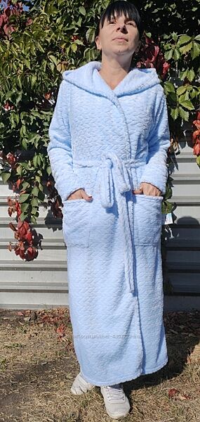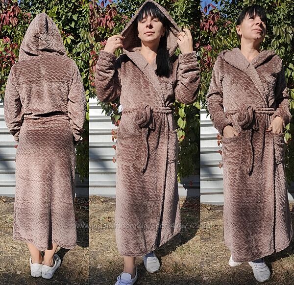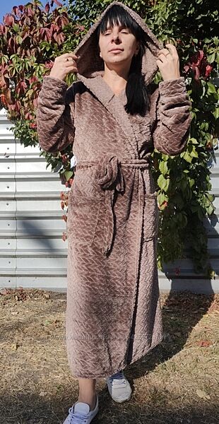 Халат махровый на запах, пояс в бокових петлях, дві кишені, капішон. Махра вел софт з лазерним узором - на зовні вистрежений малюнок на глазкій махрі - та пухнистий з середини.