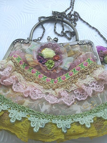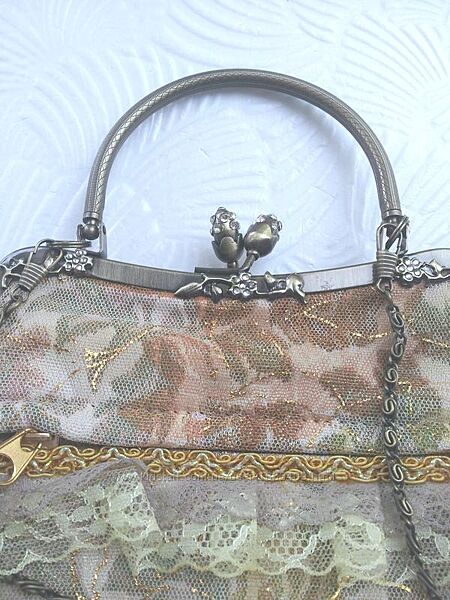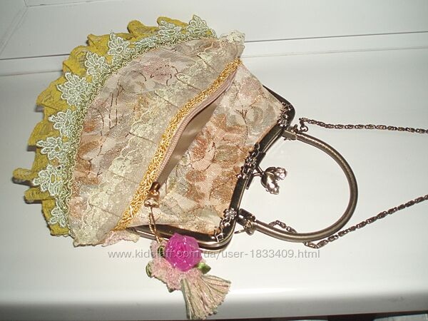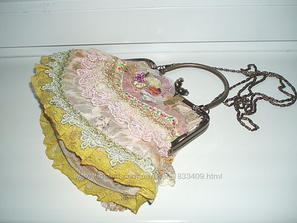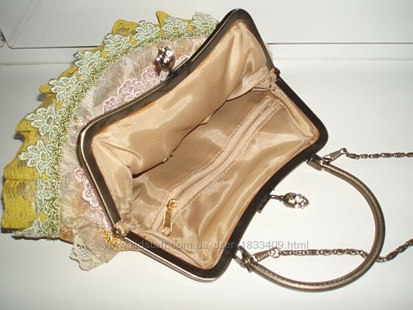 Яркая не стандартная,нарядная и вместительная сумочка - вся в кружевах и оборках по парче. Состояние, как новая.Сумочка frame для настроения с интересной фурнитурой, добротного качества.