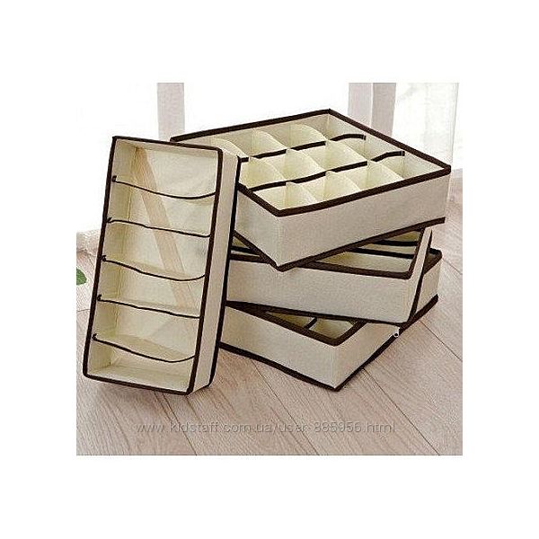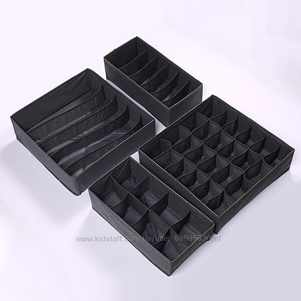 Набір органайзерів для нижньої білизни. Універсальний набір органайзерів для зберігання предметів спідньої білизни, бюстгальтерів шкарпеток, маєчок та інших дрібних аксесуарів. Всі речі можна розділити у зручному для вас порядку – за кольорами, брендами тощо. В комплект входить чотири органайзери Розміри в комплекті:1шт: 33,5 х 30 х 9 (24 квадратні осередки)1шт: 33,5 х 30 х 9 (7 прямокутних, довгих осередків)