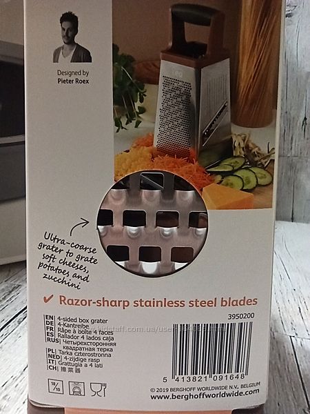 Терка BergHOFF Leo — универсальный и незаменимый инструмент на вашей кухне. Изготовлена из высококачественной нержавеющей стали, имеет лазерную заточку (острую и долговечную), позволяющую натирать овощи в обоих направлениях. Ручка изготовлена из полипропилена и силикона, благодаря чему гарантирует безопасную работу. Подходит для мытья в посудомоечной машине.Количество насадок/плоскостей 4 шт.