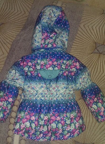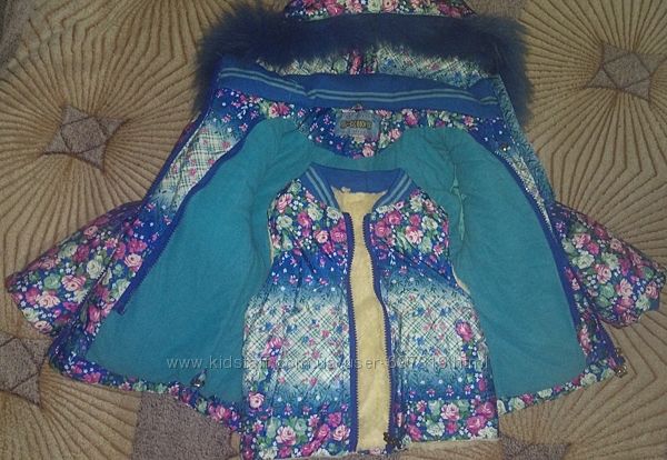 Зимняя курточка на малышку рост 86 в отличном состоянии.Как видно на фото есть подкладка в виде жилетки, которая отстегивается. Капишен на молнии, отстегивается.