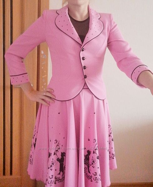 Очень красивый костюм розового цвета с аппликациями-трафарет. Производства Беларусь. Размер 44. (170-88-96)Состав 100 % полиэстрЮбка полный сонцеклеш.