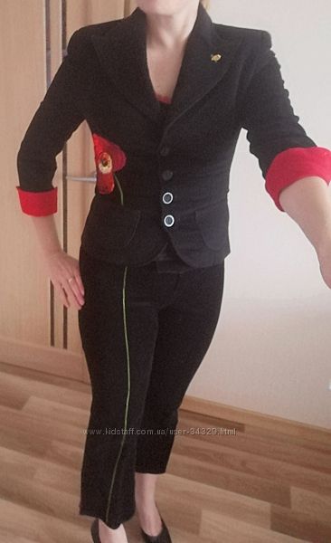 Очень прикольный костюм с вышивкой. Вышивка продолжается и на штанину. Штаны с разрезами, на пиджакет на рукавах отвороты.Пиджак из бархата, брюки из микровельвета.Замеры