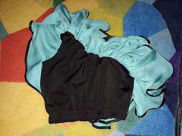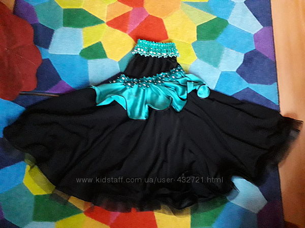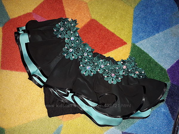 Костюм черный с зелеными / бирюзовыми оборками и кружевом, на тоненькую девочку. Профессиональный пошив, камни АВ crystal 10мм и 5 мм, пришиты надежно, есть еще много по 5мм, отдам впридачу, можно добавить к украшению. Юбка на резинке, солнце, двойная, с ригелином. Топ из плотного трикотажа, на одно плечо, на любое. Спереди и по спинке все одинаковое.Замеры юбки: