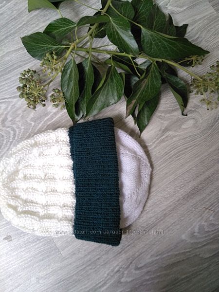 Теплая мягкая шапка, сидит по голове, на макушке ничего не торчит и не свисает. Плотная резинка с отворотом хорошо удерживает шапку на голове. Верхняя часть связана рельефным узором. Подклад цельновязанный, делает шапку теплее и не позволяет просвечиваться волосам, что является основной проблемой белых шапок.Отворот темно-петрольного цвета, верхняя часть - перламутрово-белая (на фото засвечено из-за перламутрового блеска), подклад - белый.