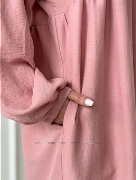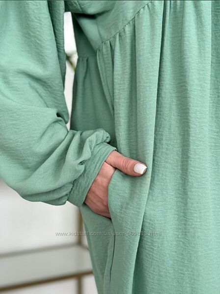 Невагома сукня з легкого фактурного крепу з відрізним низом і довжиною міді. Сукня з V-подібною горловиною та довгими об´ємними рукавами на манжетах. Модель вільного прямого крою із бічними кишенями.Розмірний ряд: S, M, L, XL