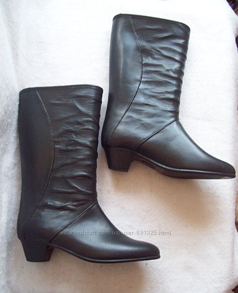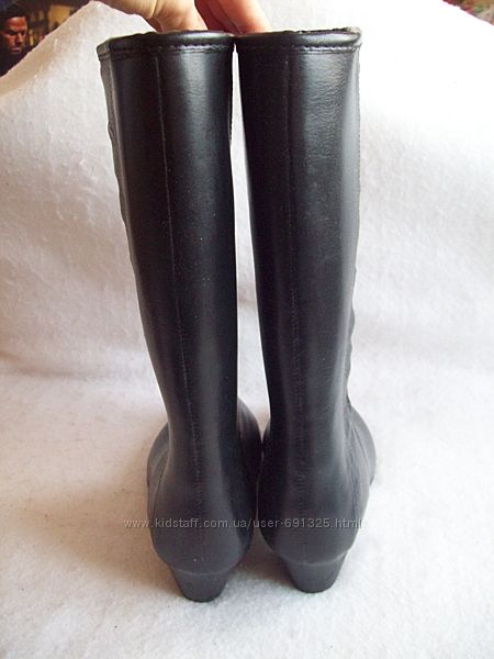 Пропоную чорні гумові чоботи на підборах. Усередині штучне хутро, застібки немає. Вживані 1 раз акуратно, стан відмінний, не підійшов розмір, вузькуваті.Розмір вказаний 5, йде на 35 розмір, довжина устілки всередині 23,5 см, ширина 7,5 см. Висота халяви 31 см, з них каблук 3,5 см. Окружність верху 36,5 см.