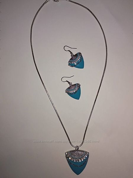 Красивый набор бижутерии-кулон и сережки,в оригинале выглядит намного лучше, чем на фото,покрытие-бирюзовая эмаль,блестящие камешки и цепочки,которые свободно свисают.Длина цепочки 50см,длина кулона 3,5 см,длина сережек 4 см.