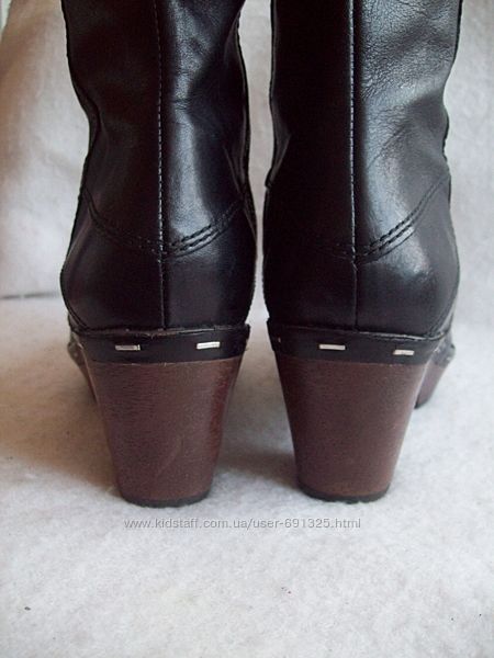 Пропоную чорні чоботи демісезонні з натуральної шкіри, від Clarks. Усередині тонка підкладка, устілка шкіряна. Уживані пару разів акуратно, стан відмінний, дивіться фото.Розмір вказаний 4 D, довжина устілки всередині 24 см, вузький носок, висота халяви 43 см, з них каблук 6 см, окружність щиколотки 25 см, окружність верху 36+2 см.
