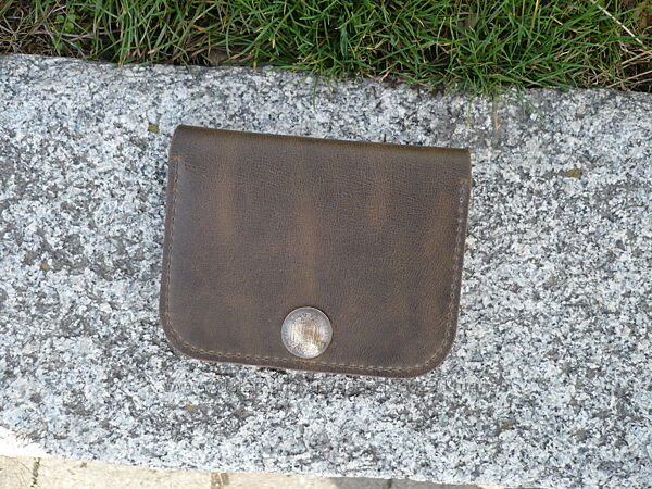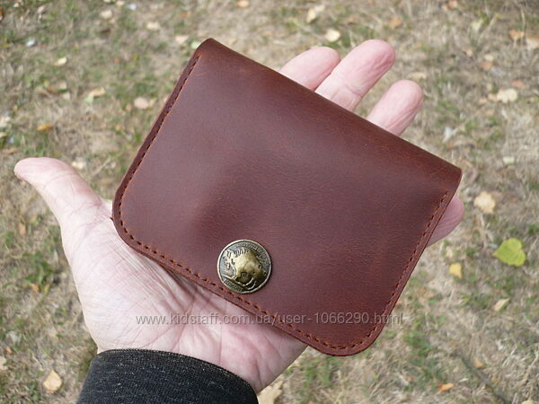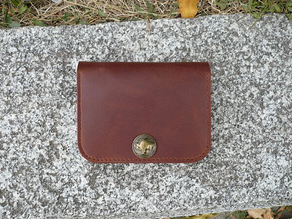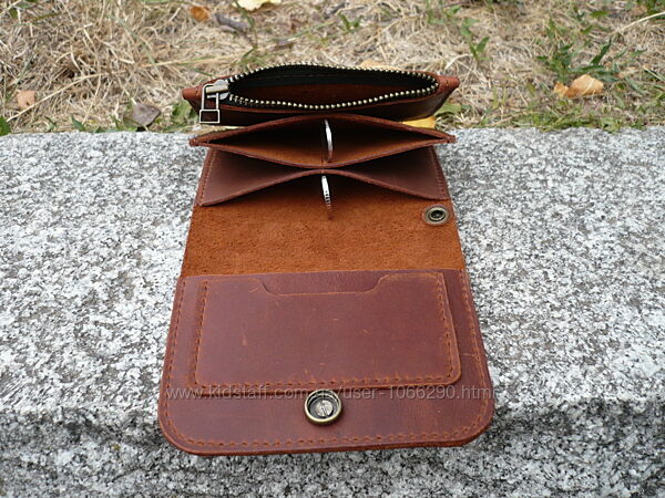 Стильный кошелек из кожи ВРХ «crazy horse», цвет коричневый-коньяк. 3 отделения, монетница и 2 кармана для карточек. Молния и бегунок YKK производства Японии. Прошит вощеной нитью galaces 0,45 мм. Размер 120*95 мм. Ручная работа. Стоимость: 700 грн.