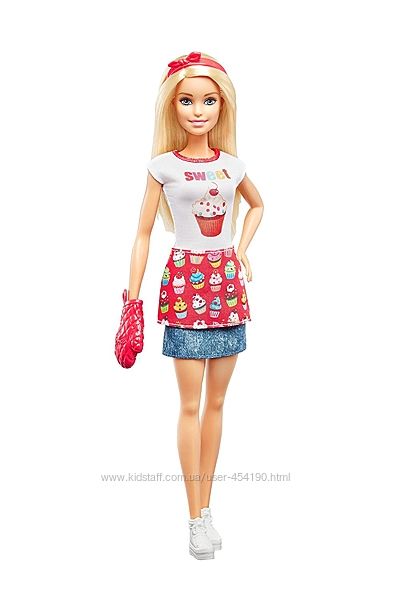 Кукла Барби Кондитер Шеф-Повар Блондинка Barbie Bakery ChefПредставляем вашему вниманию игровой набор Барби Кондитер. В набор входит кукла из серии "Профессии" и множество аксессуаров, необходимых для приготовления тортов и пирожных. У Барби голубые глаза и длинные светлые волосы, украшенные красным ободком с бантиком. Барби одета в белую футболку с принтом в виде пирожного, джинсовую юбку, яркий фартук с множеством капкейков и белые кеды.