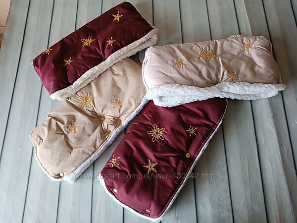 Муфта на коляскуОвчина внутри. Сверху водоотталкивающая и ветрозащитная ткань. Очень тёплая, греет ручки- проверено на себе.