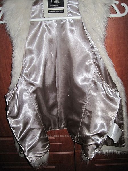 Жилет пошит просто и красиво! Сзади спинка - кожа, а лицевая сторона - мех. Искусственный или натуральный - точно не скажу, не разбираюсь. На ощупь очень приятный, не лезет. Спереди полы жилета слегка длиннее спинки. Внутри шёлковая подкладка. Пошит очень красиво и качественно!
