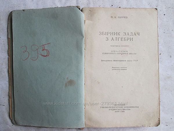 Алгебра укр. збірник задач для 6-7 клас. Повна назва: Зборник завдань з алгебри частина 1. для 6-7 класів семирічної та середньої школи. Автор: П. А. Ларичев Видання 3 з РФ. Учпед. Радянська школа Київ 1951 р 243 сторінки тверда обкладинка. Алгебра 1951 алгебра УРСР, алгебра СРСР, алгебра УРСР
