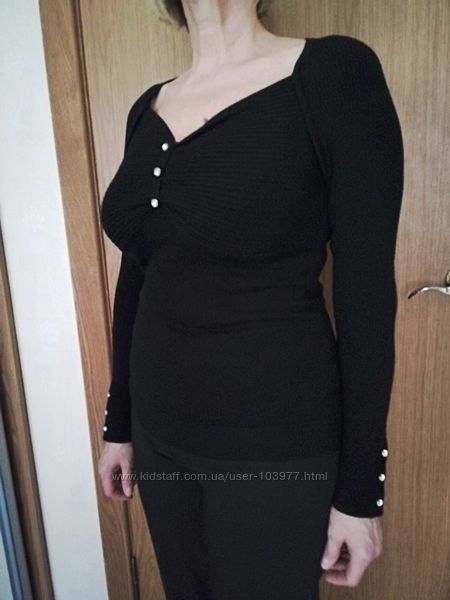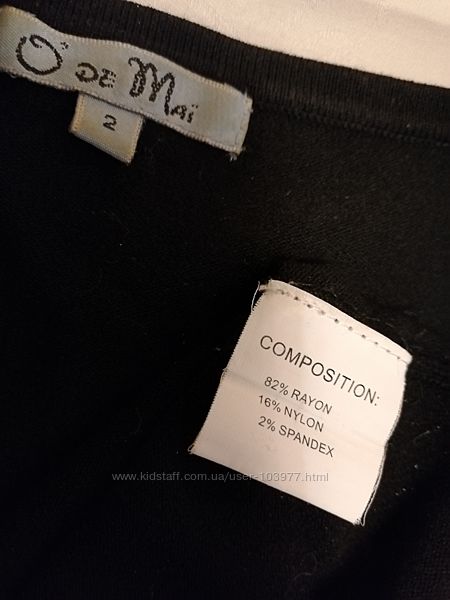 Деловая женская кофточка O de Mai, Франция. Оригинал. Состояние: идеальное, одевалась один раз. Размер: производителя-2, европейский-38. Полу обхват груди- 42 см, плечи-нет, длина рукава- 46 см, длина -69 см, ширина по низу-43 см. Состав: 82% rayon, 16% nylon, 2% spandex. Цвет: черный. На груди кофты сборка и низ рукавов украшены по три пуговички с блестящими камушками. Низ кофточки на резинке. Крой рукава от горловины. Размеры модели: 99-78-105, рост 169.Оплата на карту Приват Банка или наличными при самовывозе.