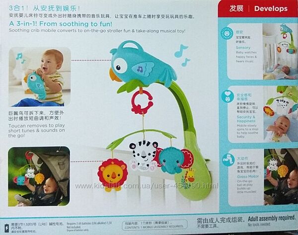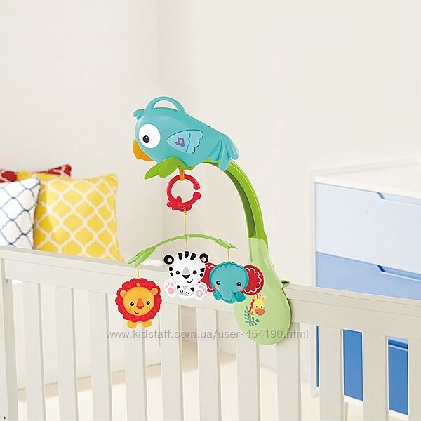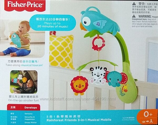Fisher-Price Rainforest Friends Мобиль музыкальный Тропические друзьяПервые игрушки малыша - важный этап для его психологического развития. Музыкальное мобиле Fisher-Price "Веселый попугай" 3 в 1 (CHR11) -это отличный выбор, если Вы хотите подарить ребенку чувство радости и способствовать его эмоциональном восприятии и развития сенсорики. В комплект входит подвеска с ярким попугайчиком и еще три маленьких подвески с изображением слоненка, тигренок и львенка. Данный мобиль от Fisher-Price сопровождаемый звуковыми эффектами (7 мелодий, 7 звуков), что хорошо влияет на музыкальное развитие ребенка. В игрушки три режима: «тихо», «громко», «выключить». Мелодия играет примерно в течение 20 минут. Фигурки попугайчики и зверушек можно открепить от мобиле и малыш сможет играть с ними как с отдельными игрушками.