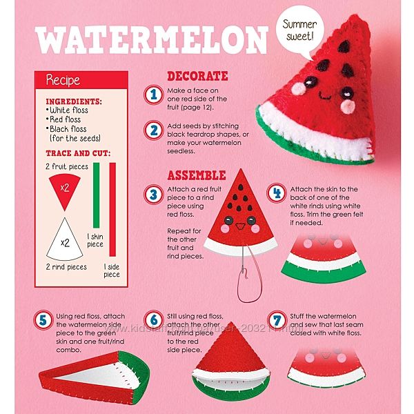 В наборе все необходимые предметы: 9 цветов фетра , 29 метров ниток, 2 иголки для вышивки, наполнитель для игрушек из полиэстра, 19 выкроек из картона, книжка 48 страниц с подробными красочными инструкциями.