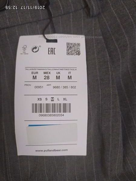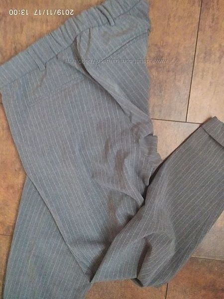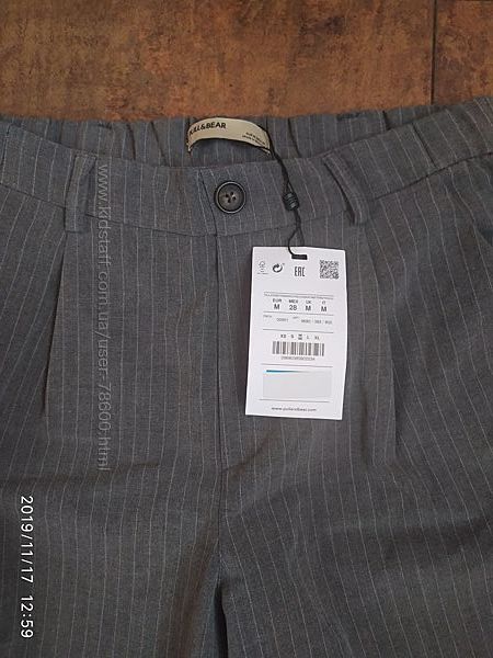 Брюки PULL&Bear,распродажа заказаны с Америки не угадала с размером №28пояс на резинке спереди обманка состав супер струящияся,мягкая ткань немного стейч 2 кармана .Очень стильные цвет серый в полосочкуЗамеры: длина - 91см. пояс-резинка-пот-34-37см/,бедра поб- 52см.внизу ширина калоши -14см.