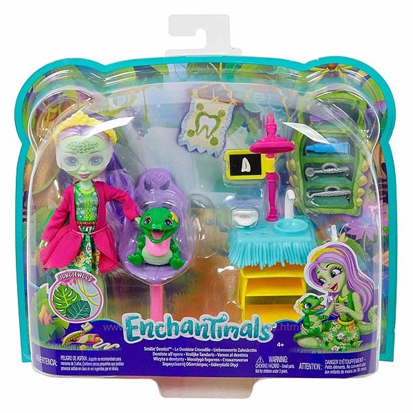 Энчантималс Стоматолог Энди Аллигатор Enchantimals DentistЗовут куклу Энди, а питомца - Марши. В наборе мы видим красивое кресло для пациента, рабочую стойку с инструментами для куклы-врача. У куклы - потрясающий, эффектный крокодилий хвост! Волосы светлые, нежного сиренево-розового цвета. А еще набор примечателен тем, что у куклы есть съемный халатик.