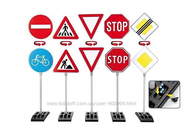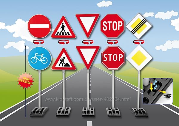 Набор дорожных знаков был создан немецким брендом Klein, который ценится за качество продукции . Набор предназначен для детей от 3 лет. В комплект входят 5 дорожных знаков со стойками . Стойки черные, с закрытым входом для налива воды, который будет загружать основание , благодаря чему метки будут стоять ровно и не упадут. Сами знаки являются двухсторонними , закреплены на пластиковой трубе, которая затем крепится к основанию. Символы включают в себя:восьмиугольный двусторонний стоп-знак B20 ,