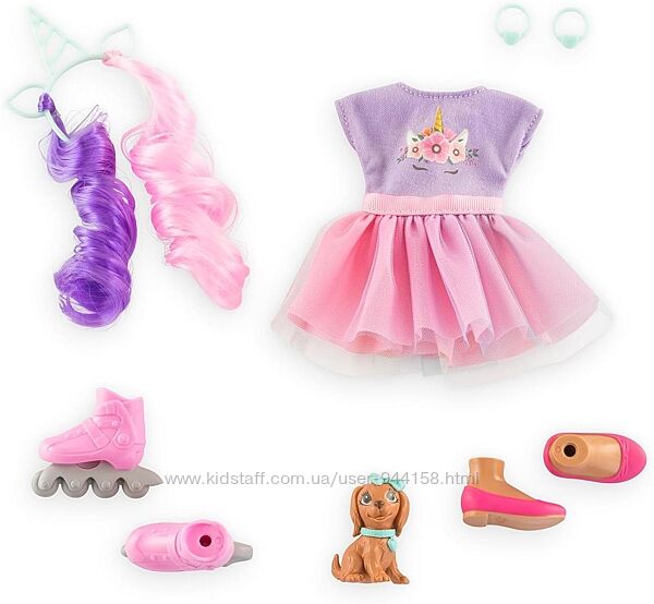 - аксессуары: съемные розовые роликовые коньки, серьги, обруч на голову с единорогом с разноцветными прядями;
