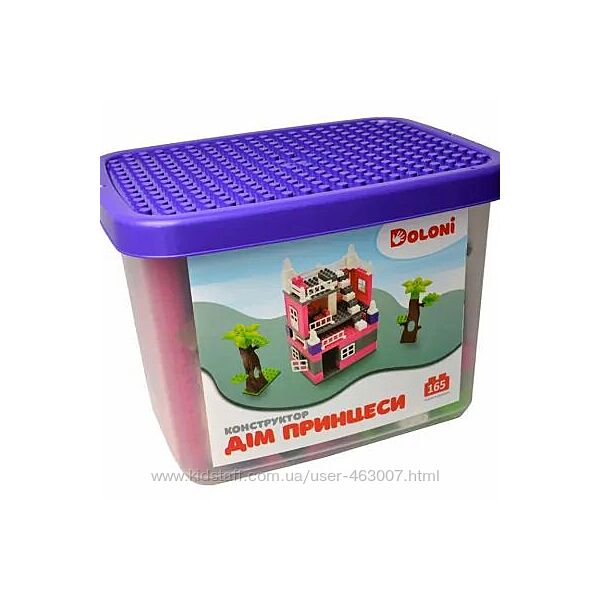 Конструктор Doloni в пластиковому блоціКонструктор є в симпатичному пластиковому боксі, зверху спеціальна кришка, вона може слугувати платформою для будиночка принцеси. Деталі конструктора зроблені з якісного пластику, вони великі та яскраві. Після гри малюк зможе самостійно зібрати всі деталі конструктора в пластиковий бокс, це дуже зручно та легко привчить дитину до ладу.