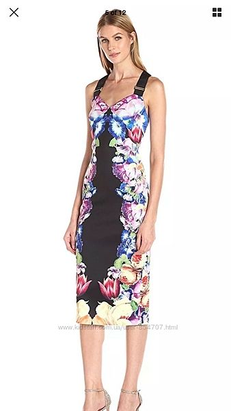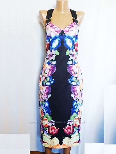 Платье женское вечернее супер шикарное нарядное Ted Baker (Размер 48-50 (L, Ted4, UK14, EU40)) Модель Tapestry Flora Buckle для роковой девушки, облегающего силуэта с цветочным рисунком, обыгрывающем фигуру, очаровательным разрезом сзади и золотой молнией. В этой модели американская актриса Нисси Нэш (Niecy Nash) была на чайной вечеринке BBC America BAFTA TV в Лос-Анджелесе. Это шикарное платье для особых случаев с неповторимым штрихом, широкими перекрестными ремешками, которые пересекаются сзади и регулируются по длине. Ткань «дайвинг», тянется и моделирует фигуру, состав 95% полиэстер, 5% эластан. На подкладке.Размер 48-50 (L, Ted-4, UK14, EU40). Замеры в спокойном состоянии: ширина по груди 48 см, по талии 40 см, по бёдрам 50 см. Длина по переду от бретели до низа 103 см.