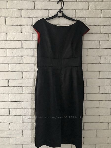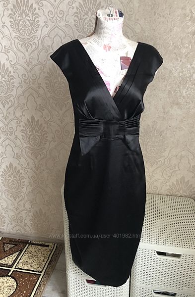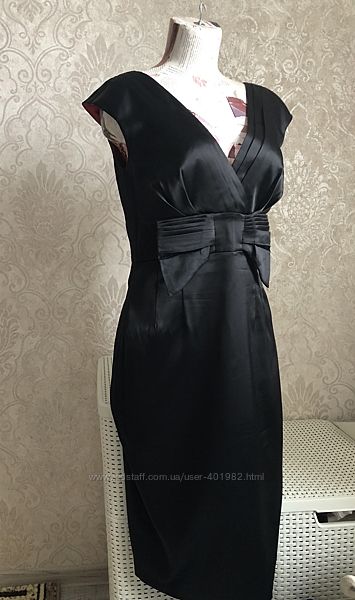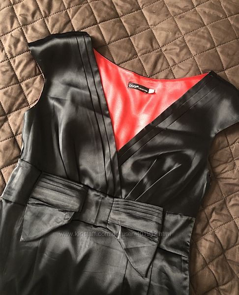 Очень красивое, нарядное платье из плотного чёрного атласа. Красная цельная подкладка из такого же материала, плотная и гладкая. Глубокий вырез, складочки на вырезе выгодно подчеркивают грудь. Декорировано не броским бантом под грудью. Завышенная талия. Сбоку застегивается на потайную молнию.Замеры: