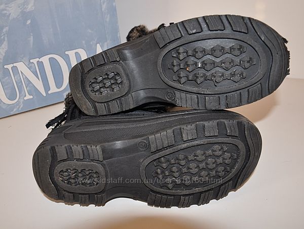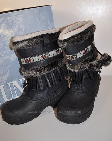 Сапоги черные с полосочкой орнамента, бахромой и помпончиками с боку фирмы TUNDRA.