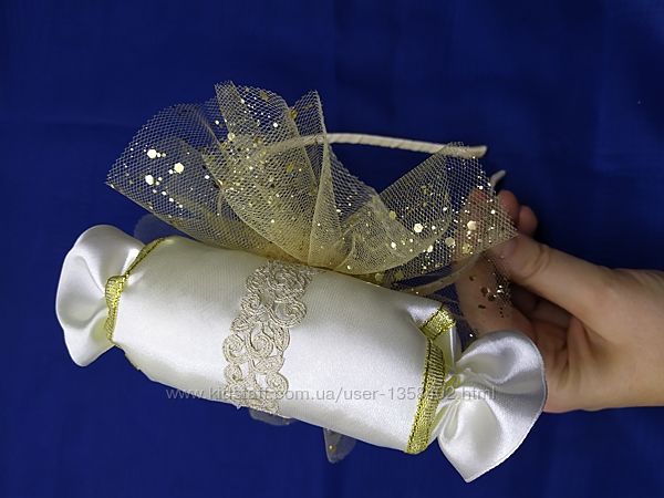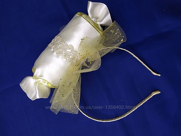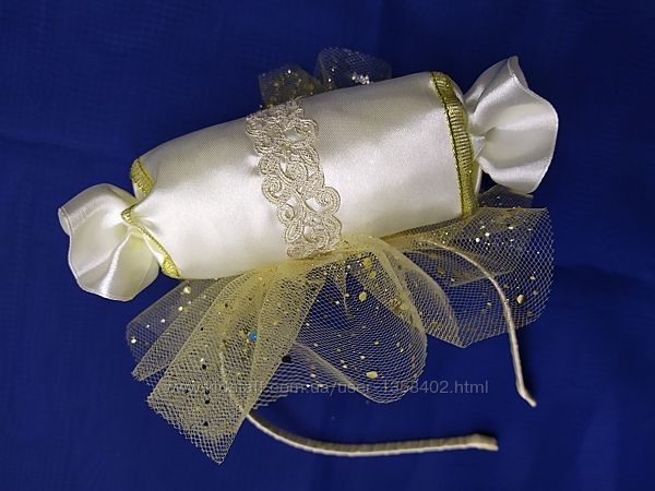 Красивая конфетка на обруче. Выполнена из атласной ленты, Фатина, парчи. Лёгкая. Смотрится очень нарядно и оригинально)Обруч размер универсальный. Набор обруч и конфетка на ручку 140 грн.