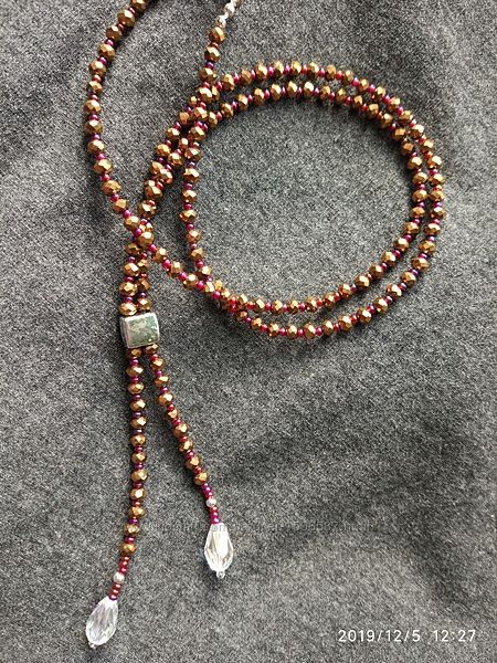 Кольє-сотуар ′Кристал мідний′ створений з кристалів - ронделів 4х3 мм кольору ′мідний металік′, 2 намистин ′крапля прозора′ з ефектом веселки, чеського бісеру Preciosa №10 кольору "бордо райдужний" і металевої фурнітури срібного кольору. Кольє зібране на міцному ювелірному тросику і має надійну застібку.Довжина кольє - 64 см до з`єднання у вигляді прямокутної металевої намистини, плюс довжина підвісок - 7 і 8 см.
