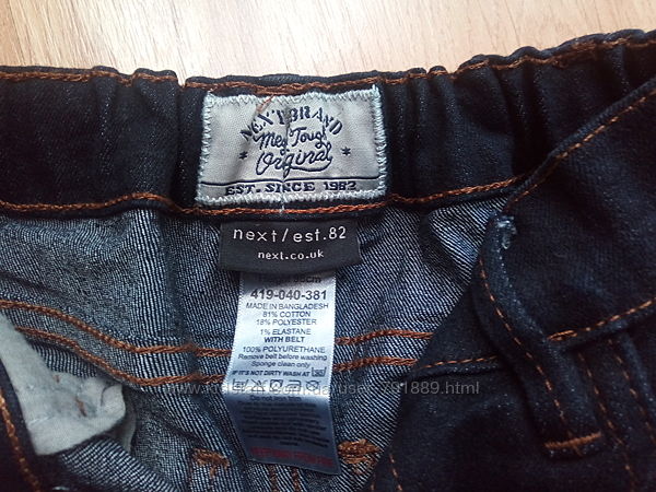 Джинси марки Next на вік 2-3 роки ,зріст 98 см, склад: 81% cotton 18% polyester 1% elastane. Колір темно- синій. Гарний стан.Пояс 25 см є стяжка на гудзики