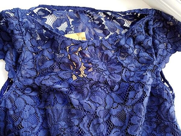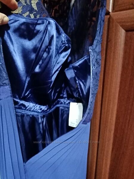 Длинное платье с кружевным топом и плиссированной шифоновой юбкой на подкладке. Приспущенные рукава ,поддерживающие планки сверху и скрытая боковая молния. Узкая корсажная лента на талии. Верх частично с атласной подкладкой.Нижняя часть изделия полностью на подкладке.Размер EUR/36