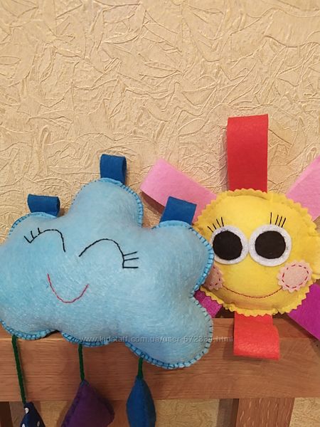 Продается наборчик мягких игрушек для малышей "СОЛНЦЕ и ТУЧКА"Игрушки с петельками, можно подвесить, выбрать нужную длину шнурочка, вместе или раздельно, в коляску, в кроватку, просто декор детской комнаты, заменить игрушки на мобиль или же дополнить его новыми фигурками.