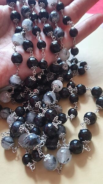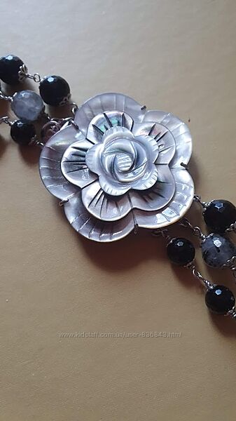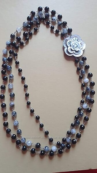 Черно-серое ожерелье агат черно-серых оттенков, тяжелое, длинные нити, декорирован застежкой с розой из перламутра, премиум-серия бреднда - 500 евро