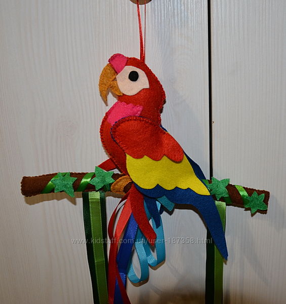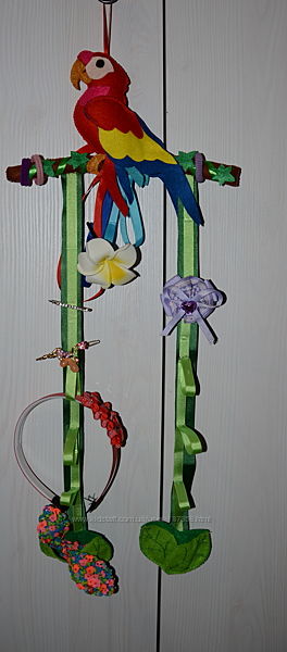 Органайзер для зберігання гумок, шпильок, обідків.Яскравий Папуга. Загальна довжина без гачка - 58 см. Розмір папуги - 20 Х 14 см. Довжина гілочки - 24 см. Довжина стрічок - 40.5 см. При оплаті на картку дешевше (без комісії сайту).