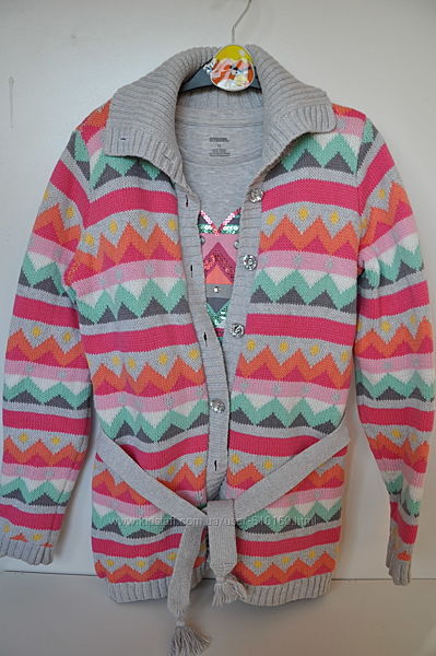 Комплект кардиган в пастельных тонах, узор зигзаг на серебренных пуговицах и футболка серого цвета с длинным рукавом, аппликацией сердце на груди фирмы GymboreeДлина по спинке кардиган 60 смдлина рукава 55 см