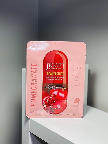 Ампульная маска "Гранат"Гранат — один из самых полезных фруктов на планете. Благодаря полезным свойствам и богатому составу его применяют для создания бьюти-продуктов. Ампульная маска «Гранат» - превосходная возможность прикоснуться к бесценной сокровищнице природы и превратить привычные процедуры в приятные и расслабляющие ритуалы. Сбалансированная формула Jigott Pomegranate Real Ampoule Mask разработана на основе гиалуроновой кислоты, бетаина, экстрактов жемчуга и картофеля, усиливающих действие средства. Благодаря увлажняющим и восстанавливающим свойствам средство смягчает кожный покров и делает его более эластичным.Особенности ампульной маски «Гранат» от Jigott: