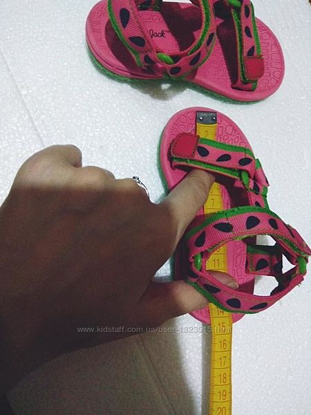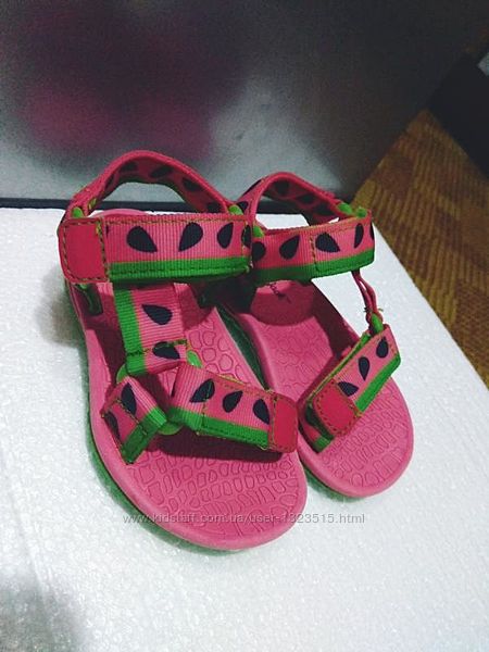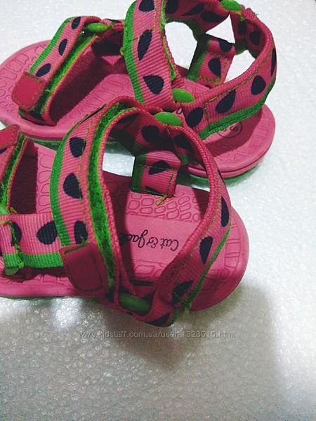 качественные яркие босоножки с принтом арбуза от "Cat&Jack" - обувь б/у - в идеальном состоянии, на подошве есть чуть заметные следы носки, липучки отлично фиксируют ногу по подъёму и в районе пальчиков!!!размер 21-22, полная длина стельки 14,5см/идеально сядут на ножку 13,5-14см