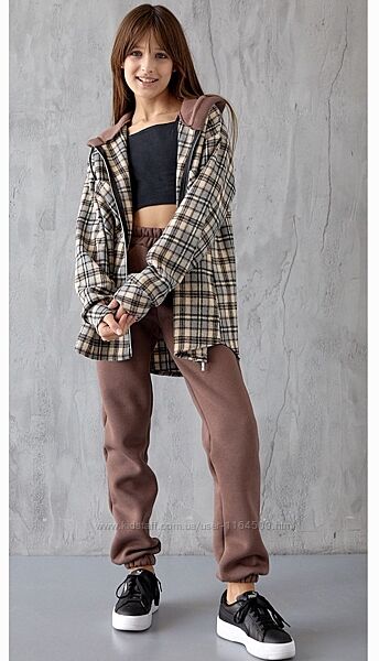 Костюм із сорочкою для дівчинки. Сорочка з капюшоном застібається на блискавку. На грудях дві накладні кишені. Сорочка зроблена з байки з вовняною ниткою. Штани виготовлені з тканини футер з начосом. У поясі гумка. Так само мають дві кишені.Заміри: