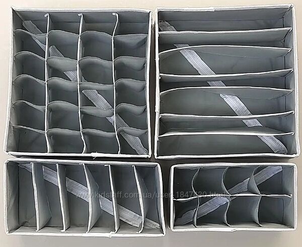 Набор органайзеров из 4 штук для хранения мелких предметов одежды - стильное и практичное решение для организации вашего гардероба. Этот серый органайзер с 24 отдельными ячейками идеально подходит для аккуратного размещения нижнего белья, носков и других мелких вещей, помогая сохранить порядок и оптимизировать пространство в шкафу.