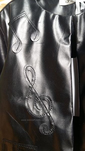 Застегивается на один скрытый крючок сверху. Украшена нашивками из того же материала, что и сам жакет, в виде нот и скрипичных ключей.