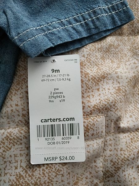 Костюм на літо від відомої фірми Картерс на 6-9 міс,рубашечка м´який приємний джинс, шортики котонові також приємні на дотик але плотніші заміри рубашки наступні довжина 34 см,під руками ширина28,5 см, заміри шортиків довжина 21,5 см,пояс 22 см в натягнутому стані 26см, в бедрах ширина 31 см. На всі цікавлячі питання відровім, відправка Укр почтою або НП за кошт покупця при повній передоплаті