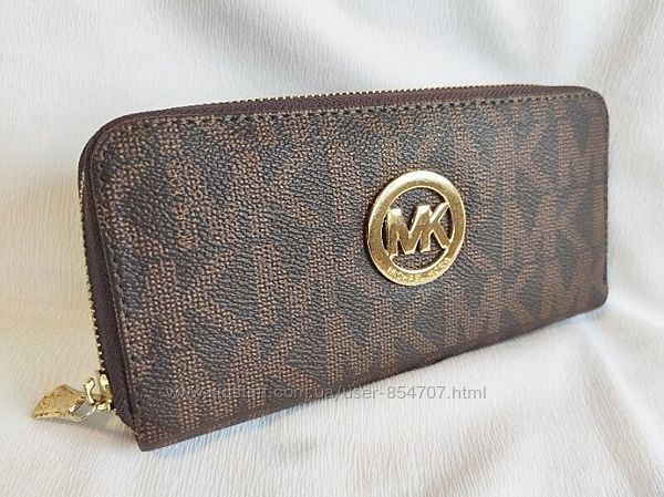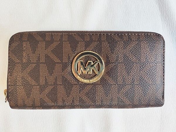 Кошелек кожаный коричневый большой на молнииОчень стильный, качественный кошелек. Изготовлен из текстурной эко-кожи, внутри эко-кожа. Молния по кругу. На лицевой стороне монограммы с логотипом MK и металлический логотип под золото. Внутри три больших отделения, отделение для мелочи на молнии, для купюр разных номиналов и множество для карт.