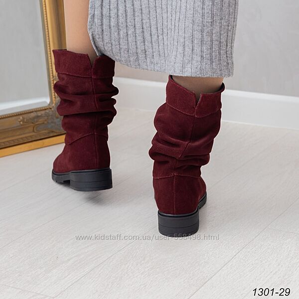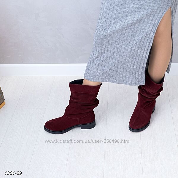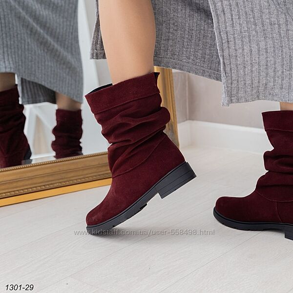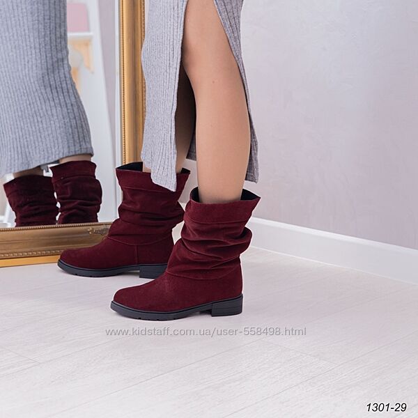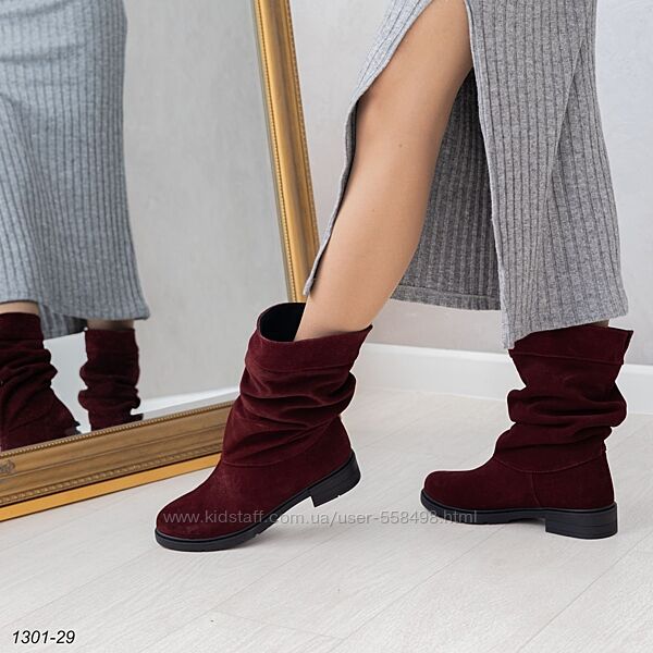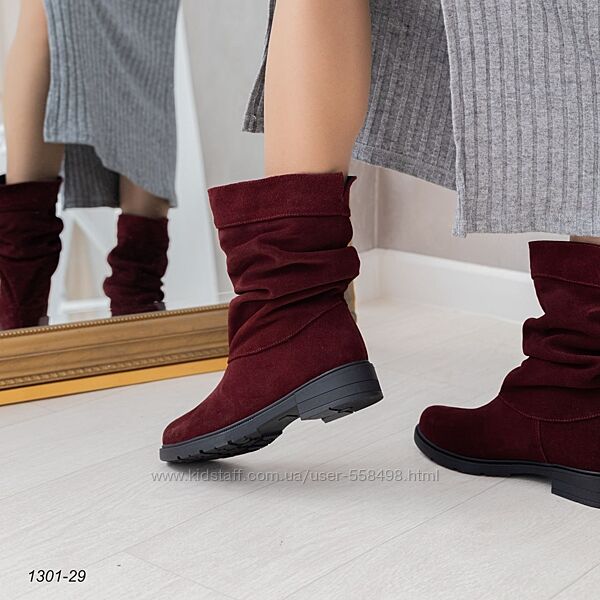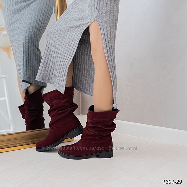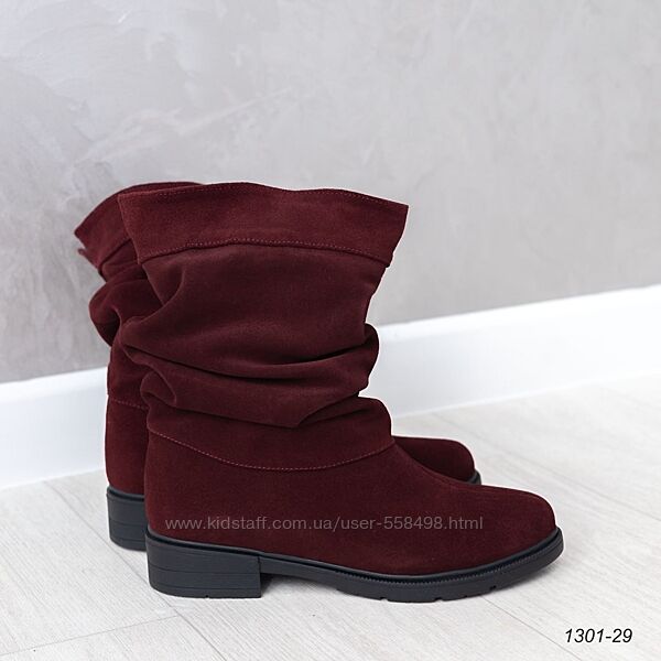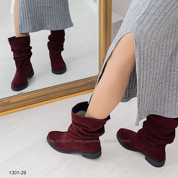 Подробное описание: Бордові жіночі замшеві зимові чобітки на невеликому підборі.